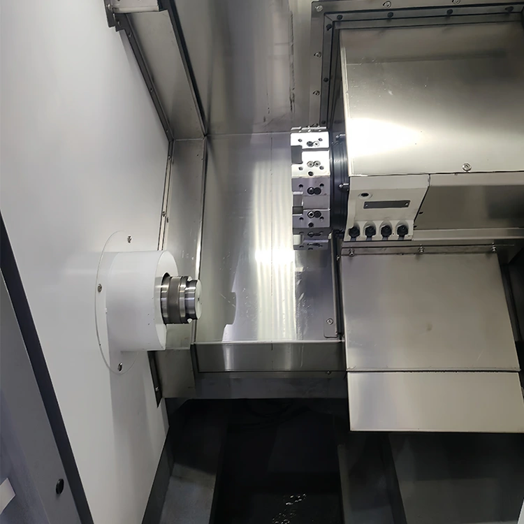 ● Καινοτόμος σχεδιασμός κρεβατιού: Η κεκλιμένη κεντρική σέλα 60° φέρνει το τεμάχιο εργασίας πιο κοντά στον χειριστή. Η κλίνη από χυτό ρητίνη εξασφαλίζει υψηλή ακαμψία, αντοχή στους κραδασμούς και ομαλή αφαίρεση τσιπς.